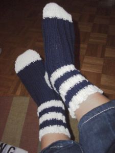 あったか靴下を手編みで コメントを残す ルームメイトの一人が編みかけの毛糸を見つけて、もし良かったら編んでみる?と言われたので、毛糸の靴下に挑戦。編みかけの(といっても一段しか編んでいなかった)糸をほどいて靴下の編み方をネットで検索して初挑戦!つま先からかかとまで、これがけこう難しかった。写真上、くるぶしまで来たのでちょっとはいてみました。サイズはぴったり!!写真下、とりあえず色が2色でひと玉ずつしかないので足首をシマシマに、でないと左右違う色になっちゃう。
