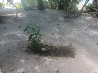 パッションフルーツ(トケイソウ)は蔦って上へ伸びれるように木の根元に。