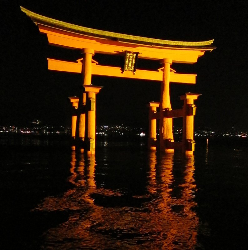 ここの大鳥居、木がとても大きんです、夜に船でくぐりました。