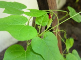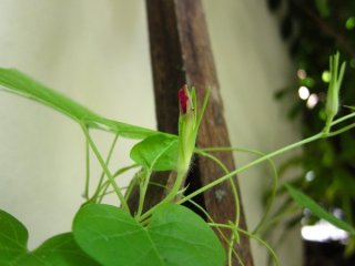 昨日の朝 アサガオの蕾がピンク色に色がついてたのを見つけました。