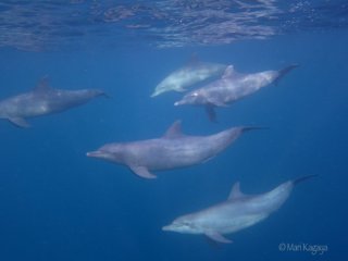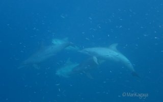私たちがシャークコーナーと呼んでいる付近に来ると5−6匹のサメが小さな魚を狙って浅瀬で泳いでいたのですが、それをじーっと眺めていたら後ろからイルカがやってきたんです。