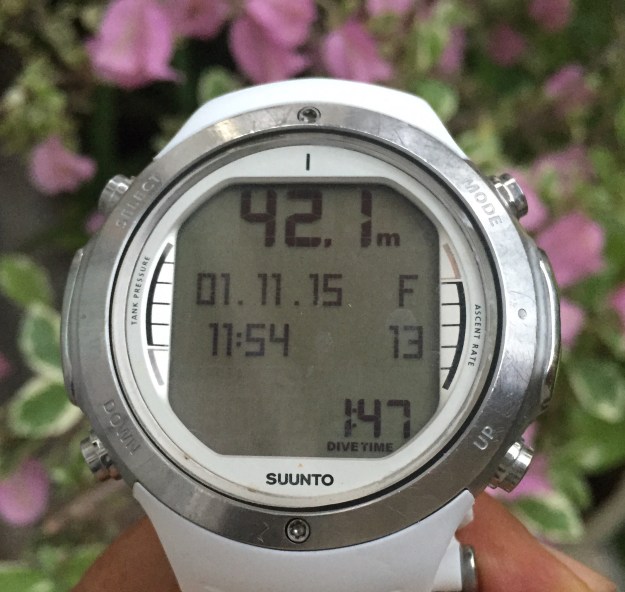 ウォーミングアップのダイビングを今までよりインテンス、えー、日本語で例えるともっと集中攻撃?いつもより長〜いハングを2回(22mの深度に長く留まって3分近く潜るなど)して次にFRCと言うテクニックで潜りました。
