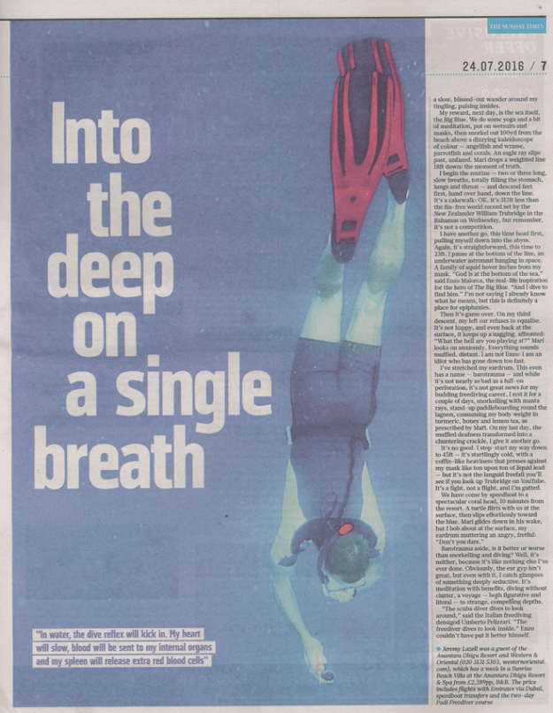 イギリスの新聞にフリーダイビングと私の記事が載りました。