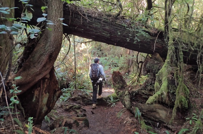 朽ち果てた樹木が重なり合って足元はフカフカしています。