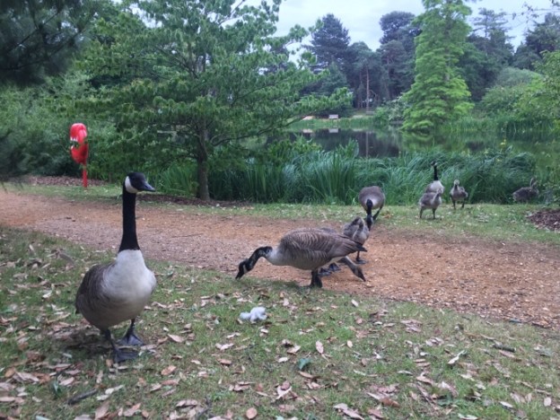 あーん、警備の方ですね?しゃがんで見守っていたらもう一羽も私の横へ来て、子供達の様子を伺っていました。子供達が池の方へ戻ると私の前に立ちはだかっていた警備のガチョウさんもそれに続いていきました。