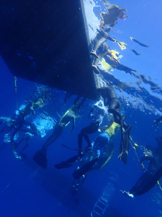 フリーダイビングのウェットスーツって大抵ツーピースなんですね、パンツがすごくハイウエストでそれを折り曲げるとスーツ同士のスキンがピッタリくっついて水が入ってこないからすごくあったかいそうです。