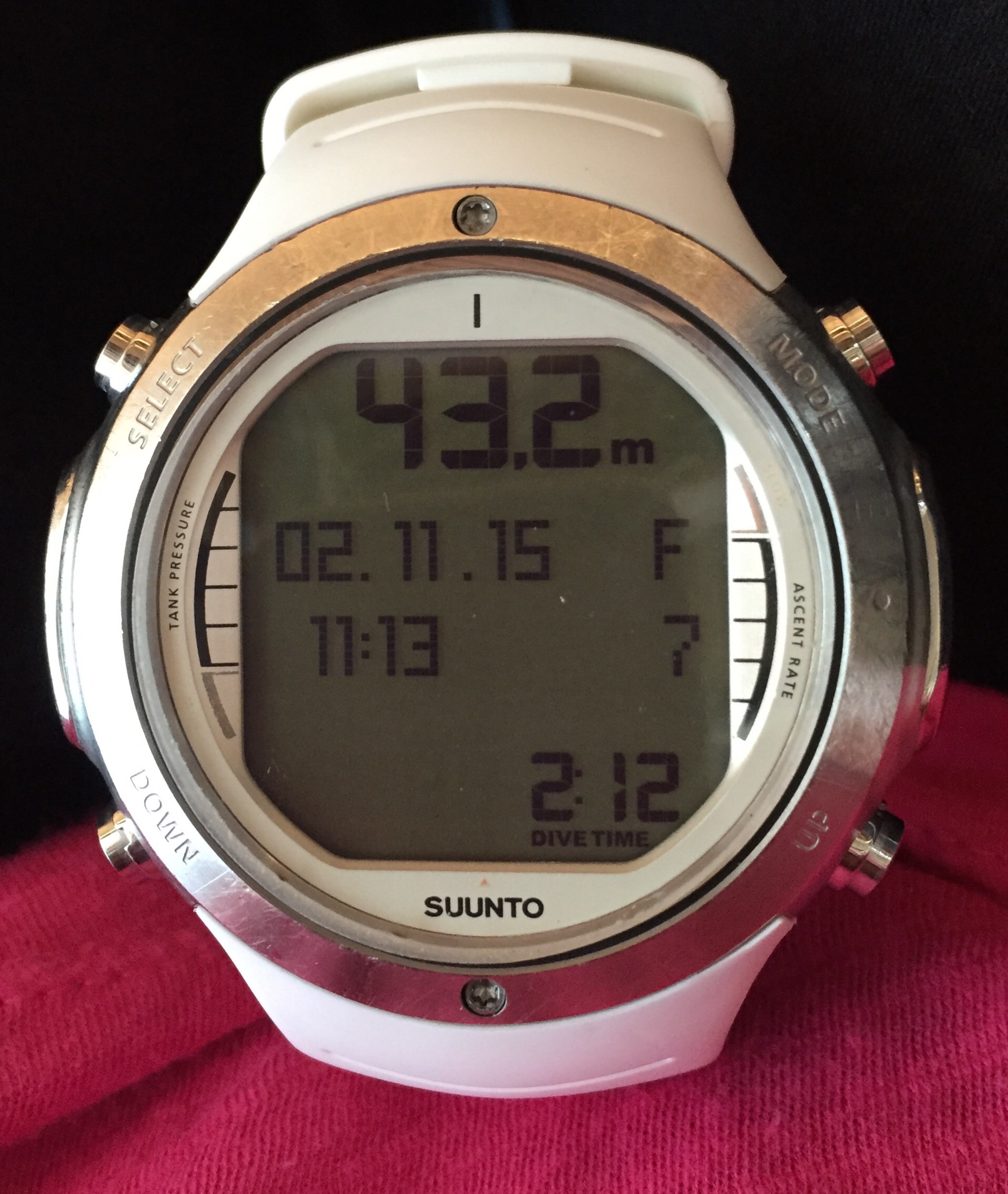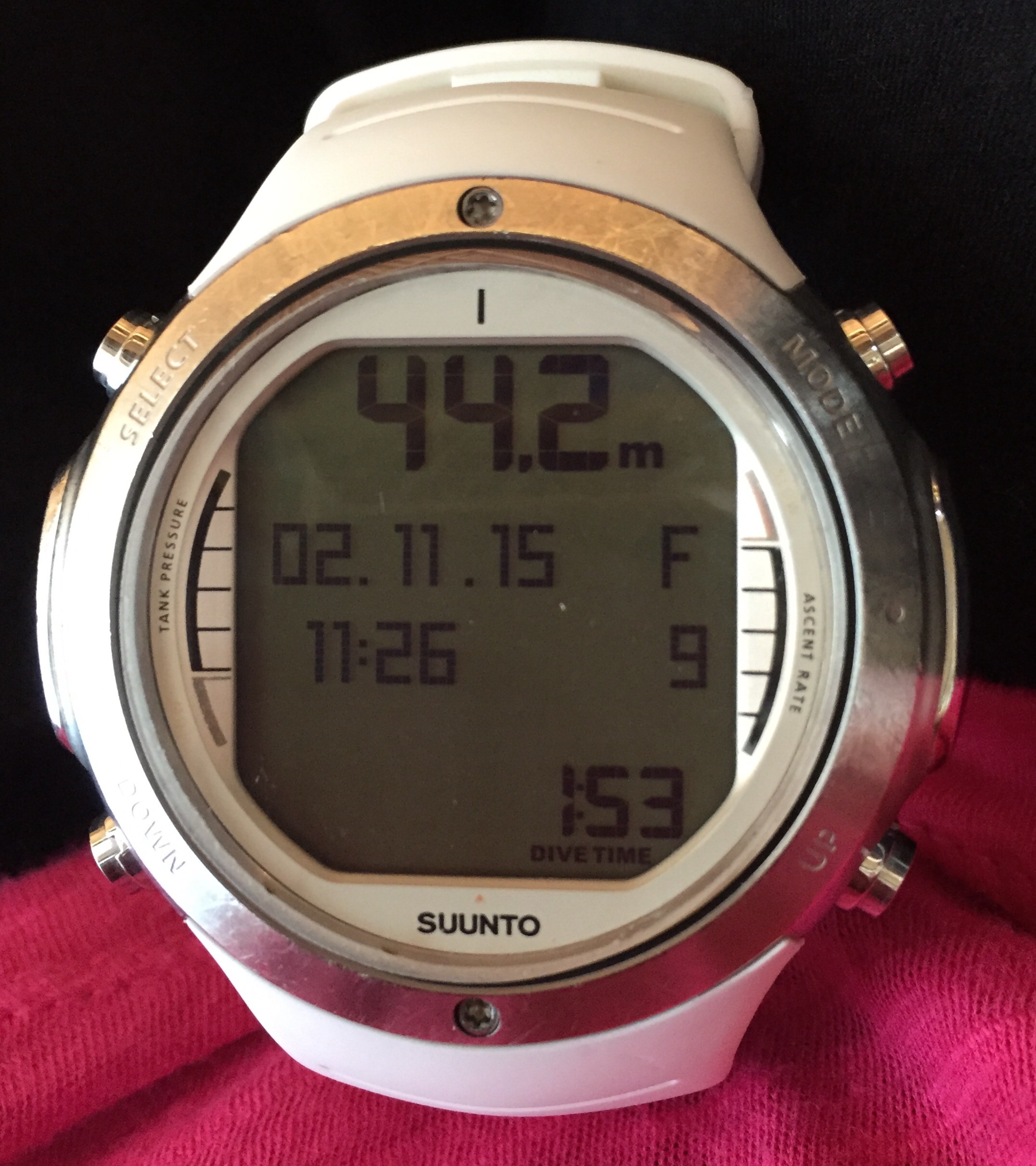 水面に着いていつものようにrecovery breathをしてOkサインを出し、深度をチェックしたら 44.2m!